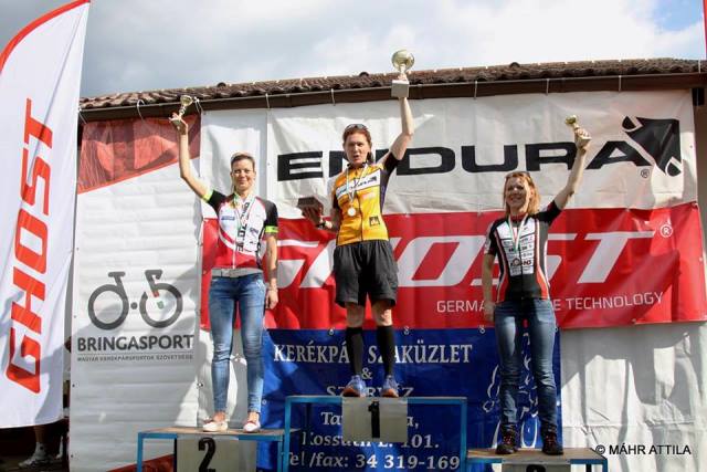 Szerencsére az első saras lefelén egész közel érek megint Beához és Mónihoz, így a betonon szépen felváltva hárman haladunk, s amikor Bea kitörő örömmel közli, mennyire jó, hogy együtt tudunk versenyezni, Cleppi megijed, hogy miatta szólnak, s elinal J Eddigre már Virág is megérkezik, ő pedig közli, hogy megjöttem, akkor már hangosan röhögök, s előreküldöm Bea és Móni után, akik éppen eltávolodnak kicsit, hogy az az ő ligája ma, menjen szépen oda játszani. Az első frissítőig szépen Móni és Bea mögött haladok, mindvégig látom őket, s egészen örülök, mert nem gondoltam volna, hogy fáradtan eddig látótávolságon belül maradok. Itt egy fura, néha óriási pocsolyákkal tarkított út jön, Móni és Bea kicsit belassulnak, magam is csodálkozom, de megelőzöm őket. Jön egy balos kanyar, s irány egy nagyon meredek, laza köves mászás, első körben feltekerek ez első felén, de iszonyat rosszul esik, a második felén aztán felénél leszállok, mert kicsit kevésnek érzem a fokozatomat ide, ráadásul szemlátomást semmivel nem gyorsabb tekernem, mint tolni. Gyors letudom, Beával és Mónival gyakorlatilag együtt érünk fel, Bea el is lép kicsit, aztán megint majdnem együtt vagyunk. Kicsit síkabb részen előrébb kerülök, aminek meg is lesz a böjtje később, mert egy kereszteződésben elmegyek jobbra, amíg nem látom, hogy szemből jönnek versenyzők. Állok hülyén, kiabálok, ez meg mi, s kiderül, nem arra megy a pálya. Túl sok idő nem veszik el vele, de Bea és Móni ismét előttem, majd jön az eltévedt sor eleje, s előznek szépen sorban, köztük Virág is hihetetlen sebességgel. Elérjük a következő frissítőt, ami után egy jó kis sáros, csúszós völgyben kell felfelé haladni, itt Móni megcsúszik egy részen, s megelőzöm, majd Beát is utolérem, akinek pár percen belül valami problémája akad a nyergével, s egy fiút parancsol le a bringáról segíteni. Miután a segítség ott van, haladok is tovább, s meglepetésemre nemsokára beérünk a Villaparkban. Előzetes terv, egy kör után kiállok, felülírva, bár a lábaim büntetnek, gondolom, ha már itt vagyok, megyek még egy kört. Innen pár fiúval meccselünk, húzzuk egymást, van, akinek bakancslistás kívánságát teljesítem, amikor ismét utolér, éppen az utolsó csúszós völgyben, viccelődünk is rajta, de túl sok beszélgetés azért már nincs, szemlátomást a fiúknak sem esik annyira jól a második kör. Nagy események sincsenek, próbálom nyomni, amennyire a lábaim engedik, a nagyon meredeken már az első emelkedő részét is inkább tolom, de meglepetésemre nem érnek utol a lányok már, így Virág után másodikként érek be a középtávon, felnőtt nők között első helyen.